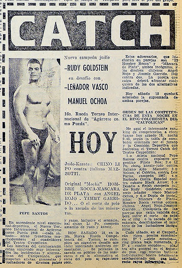 PEPE SANTOS.- Chileno. Tiene residencia en Buenos Aires. Casado con argentina. 3 hijos. Lucha desde hace 20 años. Es empleado de una notaría en Santiago. Pesa 92 kilos, mide 1.74. Se ha desempeñado como profesor de educación física en Montevideo. Lucha sin zapatillas. En 1960 en Lima sufrió la fractura de un hombro. Fue campeón de lucha libre en 1962.