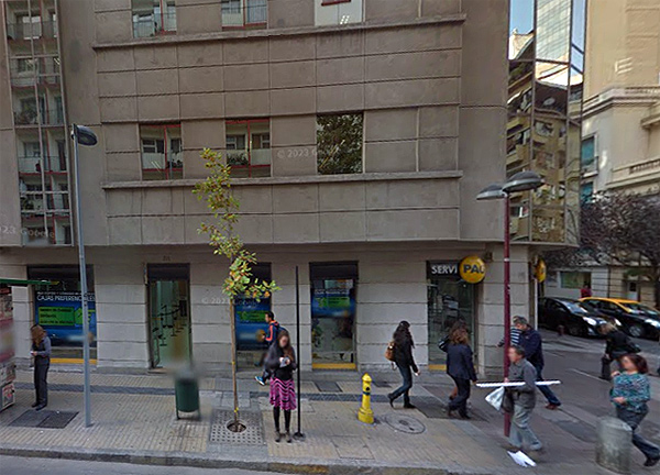 El zócalo en donde estaba el León Rojo de Miraflores 311 llegando a Huérfanos. Imagen de Google Street View.